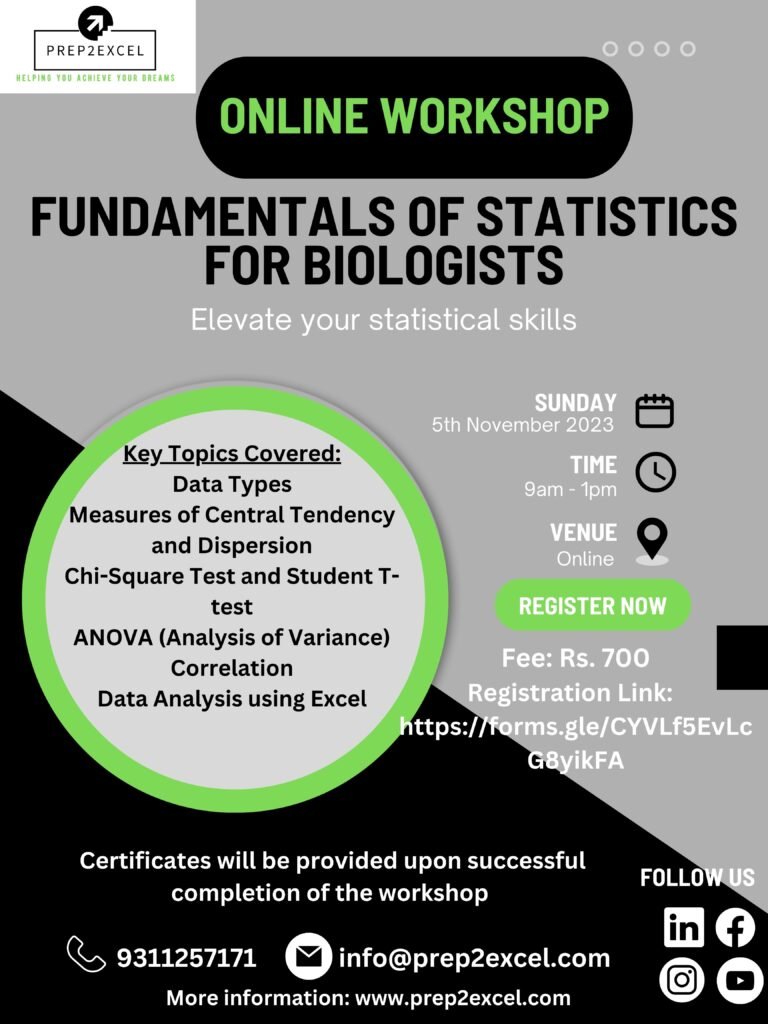 Register for Online Workshop on ”Fundamentals of Statistics for Biologists” a hands-on training program on Microsoft Excel conducted by senior Bio-statistician!