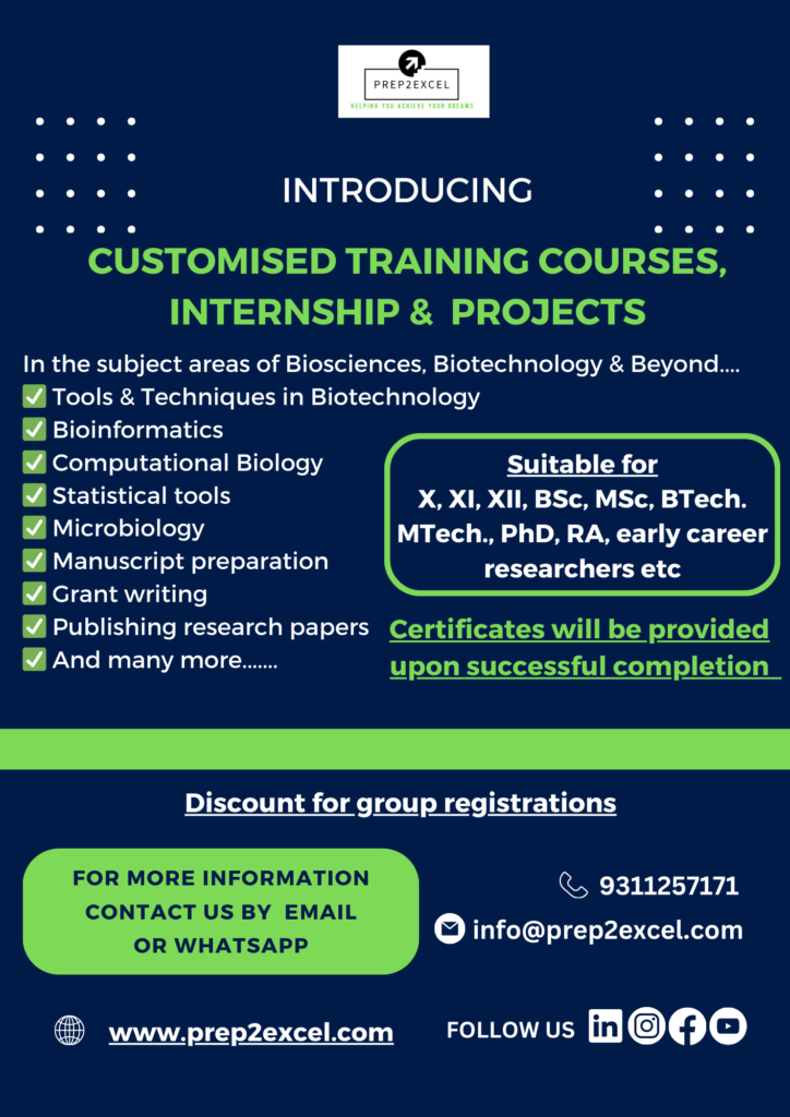 Introducing customised training courses, internships and projects in subject areas of Biosciences, Biotechnology and beyond! Check the website for subject areas.